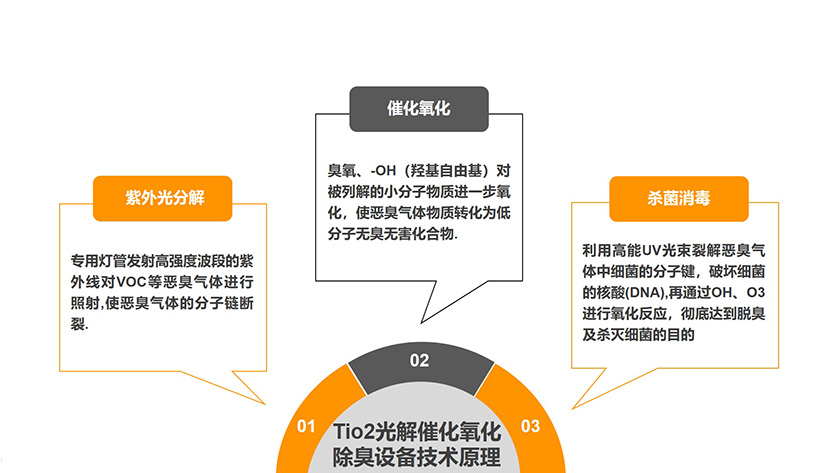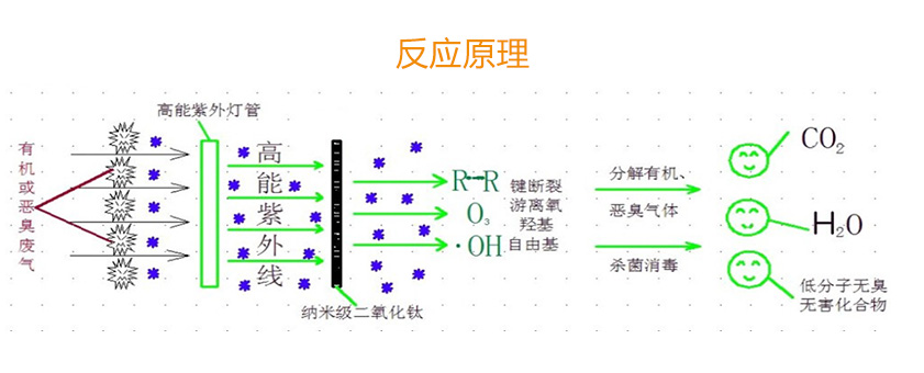 在Tio2光解催化氧化除臭設(shè)備內(nèi),高能紫外線光束與空氣、TiO2反應(yīng)產(chǎn)生的臭氧、-OH (羥基自由基)對惡臭氣體(硫化氫、氨氣、硫醇)進行協(xié)同分解氧化反應(yīng),使惡臭氣體物質(zhì)轉(zhuǎn)化為無臭味的小分子化合物或完全礦化,生成水和CO2,達標(biāo)后經(jīng)排風(fēng)管排入大氣。