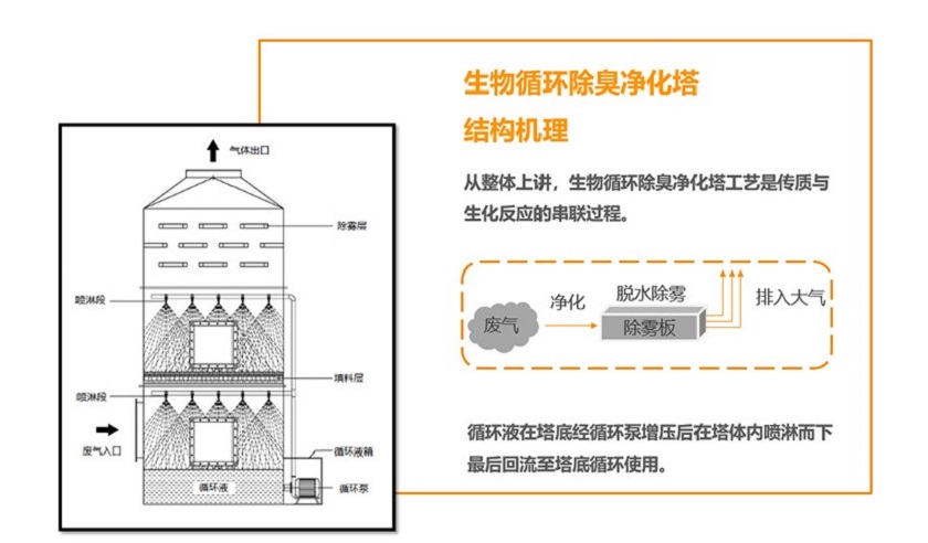 生物循環(huán)除臭凈化塔工藝是異味(惡臭)傳質(zhì)過程與生化反應(yīng)的串聯(lián)過程。